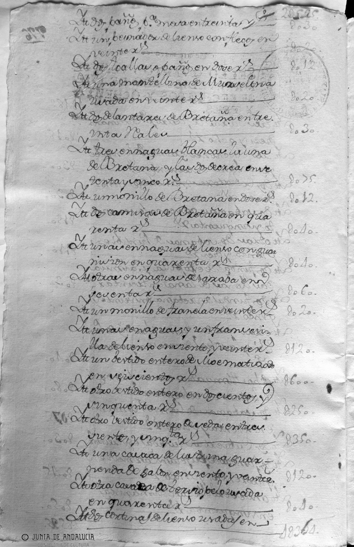 ytt dos paños pa mesa en treinta rs ytt un peinador de lienso con flecos en veinte rs ytt dos toallas o paños en dose rs ytt una mantellina de murselina usada en veinte rs ytt delantares de Bretaña en treinta reales ytt tres ennaguas blancas la una de Bretaña y las dos de crea en setenta y sinco rs ytt un monillo de bretaña en dose rs dos camisas de Bretaña en quarenta rs ytt unas ennaguas de lienso con su guarnision en quarenta rs ytt otras ennaguas de sarasa en sesenta rs ytt un monillo de franela en veinte rs ytt unas enaguas y un fransesilla de lienso en siento y veinte rs ytt un bestido entero de moe matizado en seisientos rs ytt otro bestido entero en doscientos y sinquenta rs ytt otro vestido entero de seda en tressientos y sinqta rs ytt una casaca de lustrina guarnesida de salon siento y veinte rs ytt otra casaca de tersiopelo usada en quarenta rs ytt dos cortinas de lienso usadas en